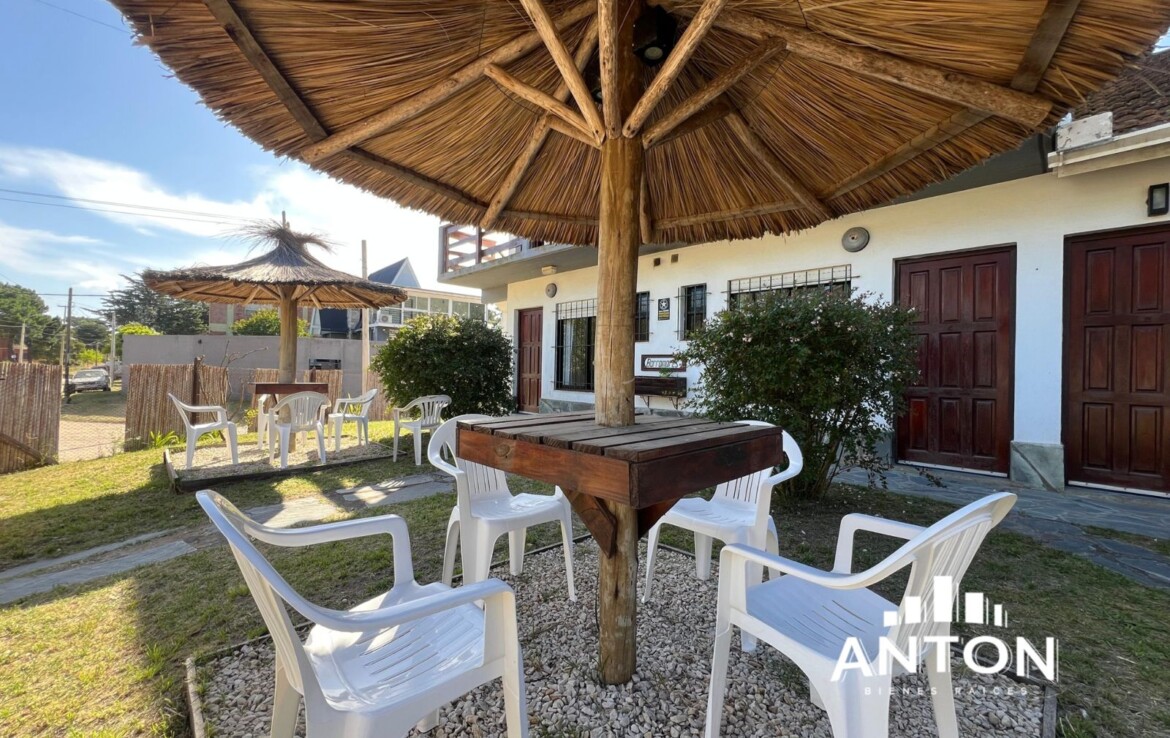Al frente, un amplio patio compartido con sombrillas tipo palmera y sillas exteriores invita a relajarse, disfrutar del aire libre o tomar unos mates por la tarde.