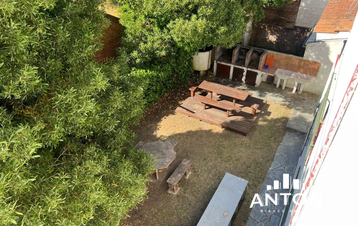 Al frente, un amplio patio compartido con sombrillas tipo palmera y sillas exteriores invita a relajarse, disfrutar del aire libre o tomar unos mates por la tarde.